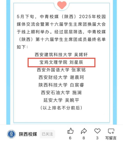 近日,中青校媒(陕西)2025年校园媒体交流会暨第十六届学生主席团换届大会于线上举办,beat365文学与新闻传播学院2022级广播电视编导专业学生刘星辰当选新一届主席团成员。