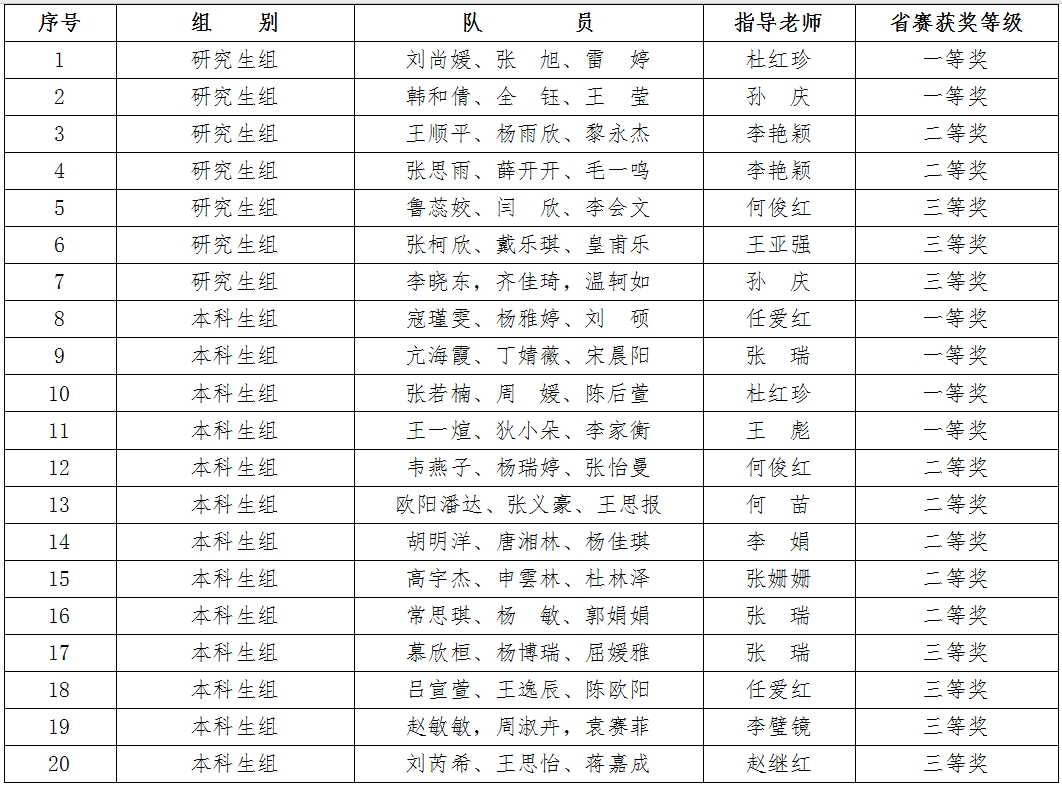 全国大学生统计建模大赛由中国统计教育学会主办,是《全国普通高校大学生竞赛排行榜》内的重要赛事之一。在教务处、研究生院的支持下,数学与信息科学学院选派具有丰富经验的教师组建指导团队,对参赛学生给予论文选题和论文写作等赛事指导。最终参赛团队以新颖的作品选题、科学的统计方法、严谨的内容设计取得了良好的比赛成绩。(教务处、研究生院、数学与信息科学学院 文/王亚强 审核/周喜华、王肖烨、刘淳安)