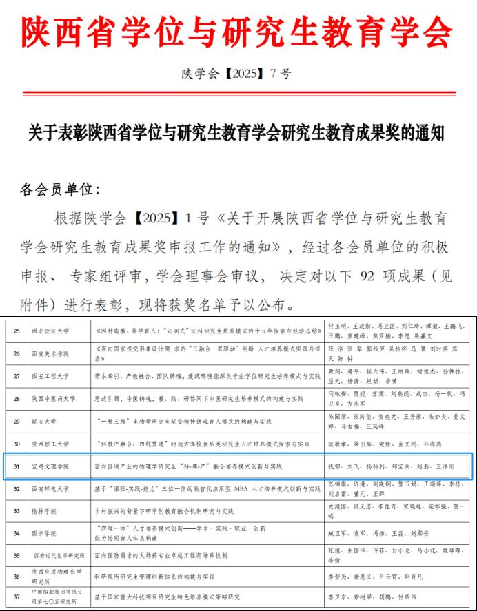 近日,陕西省学位与研究生教育学会发布《关于表彰陕西省学位与研究生教育学会研究生教育成果奖的通知》(陕学会〔2025〕7号),beat365物理与光电技术学院钱郁教授主持的《面向区域产业的物理学研究生“科-赛-产”融合培养模式创新与实践》研究生教育成果荣获二等奖。