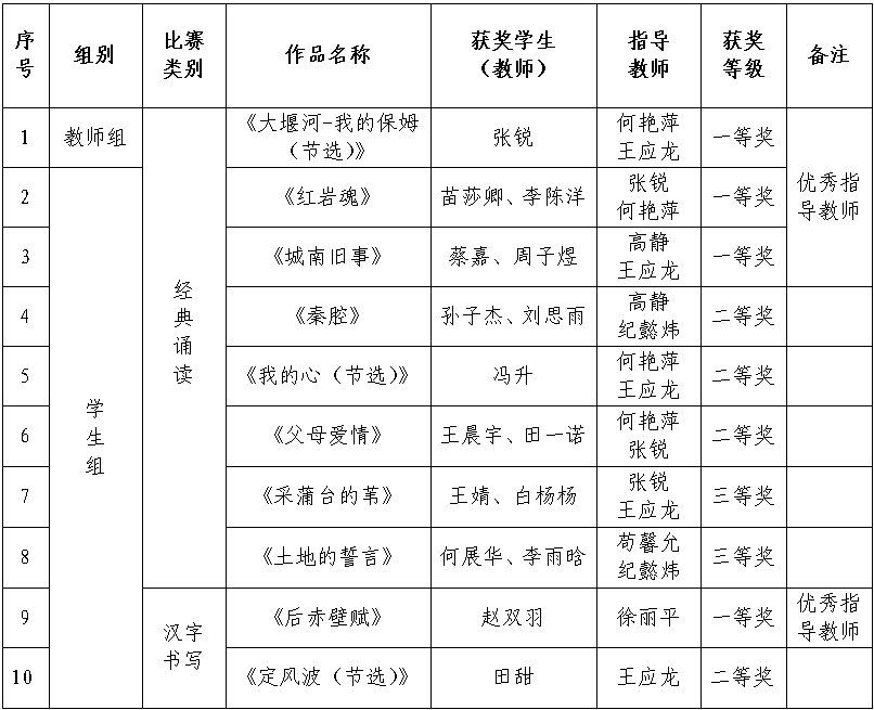 近日,陕西省教育厅办公室公布了第七届“诵读中国”经典诵读大赛和“笔墨中国”汉字书写大赛(陕西赛区)评选结果,beat365取得优异成绩。在经典诵读大赛中,beat365教师获一等奖1项,学生获一等奖2项、二等奖3项、三等奖2项;在汉字书写大赛中,beat365学生获得一等奖1项,二等奖1项。王应龙、何艳萍、高静、张锐、徐丽平五位老师获“优秀指导教师”称号。