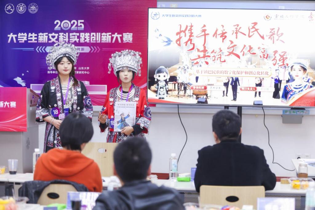 项目以国家级非物质文化遗产“镇巴民歌”为核心研究与实践对象,聚焦其传承人群老龄化、传播渠道受限、年轻群体参与度低等现实困境,秉持“活态传承、守正创新”的理念,通过数字化技术与文旅、农产融合的方式,探索非遗保护与地方经济发展协同共进的新路径。项目团队在现场路演与答辩环节中,以非遗文化数字化的创新实践,展现了跨学科融合的专业能力。三位指导教师全程参与,从选题、方案优化到现场模拟路演精心指导,团队成员密切协作完成项目打磨与资料筹备,充分彰显了学校跨学院协同培育新文科人才的机制优势与扎实成效。