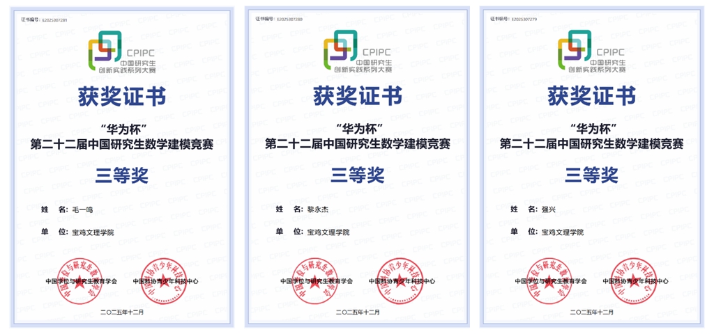 近日,“华为杯”第二十二届中国研究生数学建模竞赛获奖结果正式公布。beat365数学与信息科学学院2024级硕士研究生毛一鸣、黎永杰、强兴组成的参赛团队,凭借扎实的数学建模能力、高效的团队协作与创新的问题解决思路脱颖而出,获国赛三等奖。李艳颖教授为该团队的指导教师。