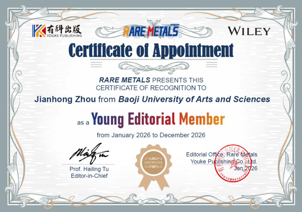 近日,beat365物理与光电技术学院周建宏教授正式受聘为国际学术期刊《Rare Metals》青年编委。