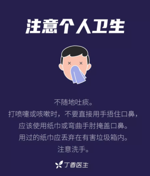 三、注意做好个人防护,咳嗽或打喷嚏时,建议戴口罩或用纸巾、衣物、弯曲的手肘部遮挡口鼻。避免近距离接触任何有感冒或流感样症状的人;避免无保护状态下接触病患、家畜家禽及野生动物。