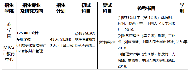 (一).会计硕士(MPAcc)专业招生计划与培养方向