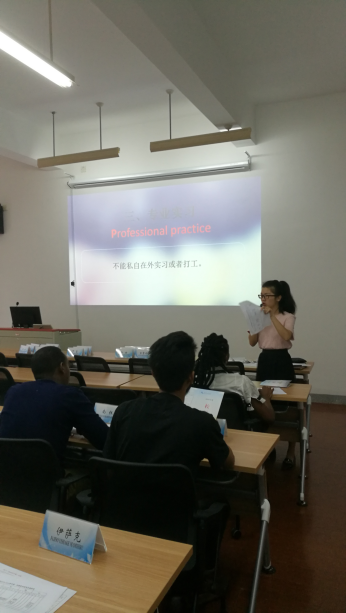 首先,唐奇老师介绍了研究生事务的三位老师:唐奇、丁洁琼、钱韬以及三人的工作分工。丁洁琼老师阐述了教学工作的管理制度,包括课程考核、资格审查、学术活动以及专业实习等方面的规定,尤其强调了留学生不能以个人名义私自在外从事工作或实习。钱韬老师从日常管理的角度,向留学生说明了请假、销假以及考勤制度,以及考勤不合格、旷课行为的相应处分。